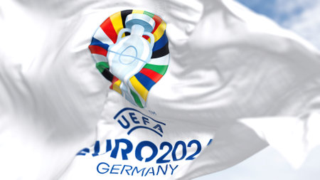 Berlin, Ger, October 2022: The flag of UEFA Euro 2024 flying in the wind. The 17th edition will take place from 14 June to 14 July 2024 in Germany. Selective focus. International sport event