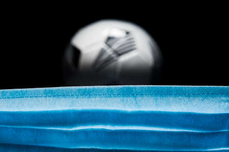 Football ball and medical mask. The concept of coronavirus quarantine measures, stopping the league, competitions, preventive measures.