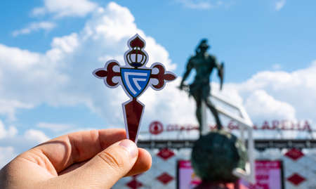 June 14, 2021, Vigo, Spain. The emblem of the RC Celta de Vigo football club against the background of a modern stadium.