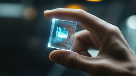 A man holding a microchip showcasing innovation in digital technology and electronics. Concept Digital Technology, Innovation, Electronics, Microchip, Man