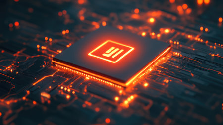 A close-up view of a futuristic circuit board with an illuminated 'Disrupted' message, symbolizing technological innovation and change. The image features vibrant orange and black tones.