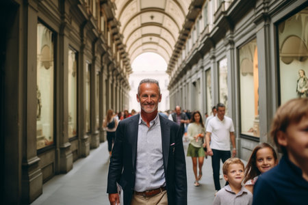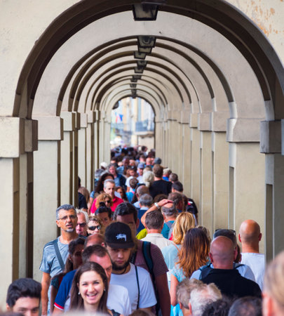 Florence, Italy August 26.2014: Many tourists walking in the Uffizi gallery taking pictures and waiting to enter museums During a cloudy day.