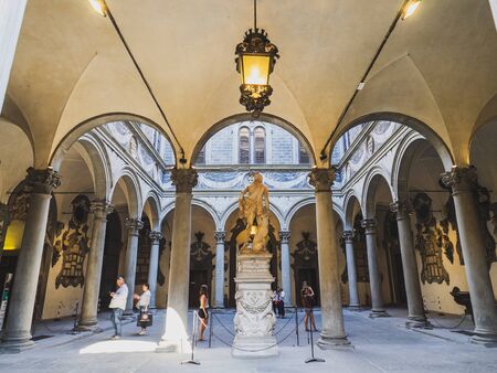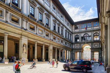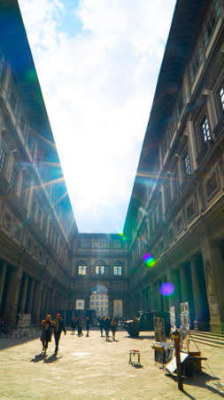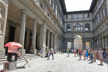 Florence, Italy - August 19, 2015: Tourists in the courtyard of the Uffizi Gallery (Galleria degli Uffizi) in Florence