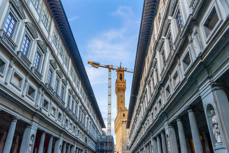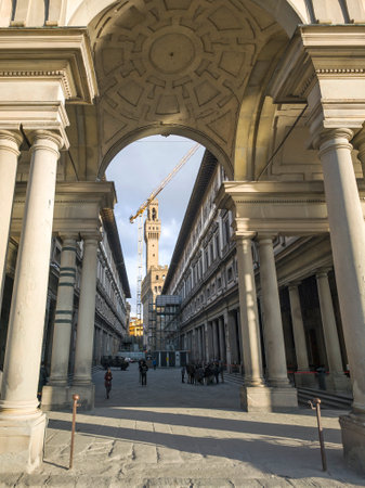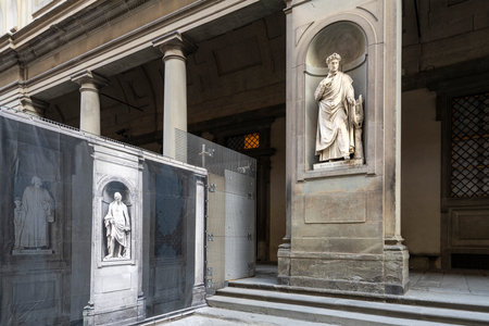FLORENCE, ITALY - MAY 31, 2019: The inner courtyard of the famed Uffizi Gallery, undergoing some exterior renovations, with the tower of the Palazzo Vecchio and the dome of the cathedral in the background.
