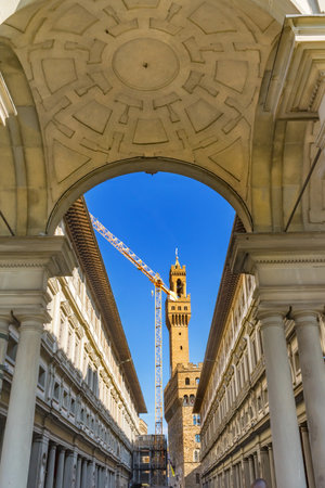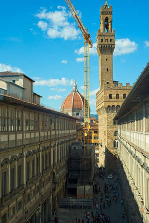 Palazzo Vecchio Uffizi Gallery Crane Florence Tuscany Italy.