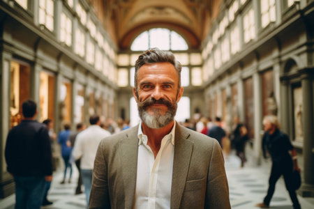 Portrait of a handsome mature man with gray beard and mustache standing in front of the gallery