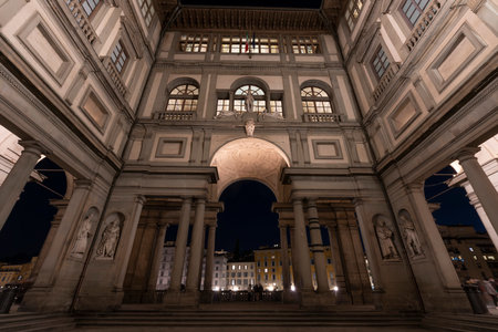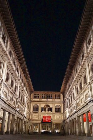 Uffizi Gallery in Piazzale degli Uffizi at night in Florence Italy.