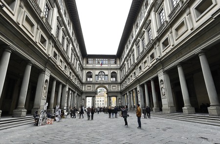 FLORENCE, ITALY - NOVEMBER 6, 2016: people on yard Uffizi Gallery. Uffizi Gallery is one of the oldest museums in Europe, its origin refers to 1560, when Vasari designed large palace with two wings
