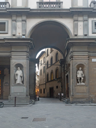 FLORENCE, ITALY - AUGUST 25, 2014: Narrow courtyard of the Uffizi Gallery called the Piazzale degli Uffizi in Florence, Tuscany, Italy. Florence is a popular tourist destination of Europe.