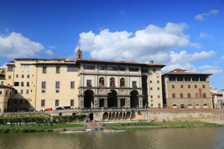 Florence, Italy - old town cityscape of Arno riverfront with Uffizi Gallery.