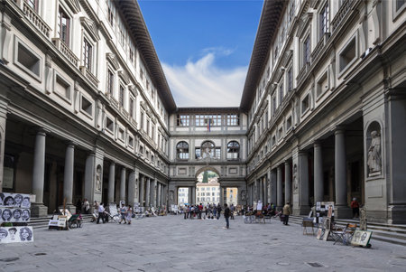 FLORENCE, ITALY - AUGUST 25, 2014: Courtyard of the Uffizi Gallery called the Piazzale degli Uffizi in Florence, Tuscany, Italy. Florence is a popular tourist destination of Europe.