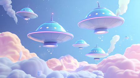 Multiple flying saucers float serenely in a pastel sky, surrounded by fluffy clouds and soft hues