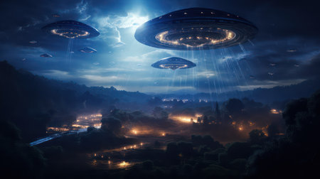 Unidentified flying objects emerge from the mist, casting ethereal light beams upon a secluded mountain town Residents gaze in awe as the enigmatic craft hover overhead, sparking speculation of an otherworldly encounter The nocturnal spectacle ignites questions and theories, leaving an unforgettable imprint on the night sky AI Generative