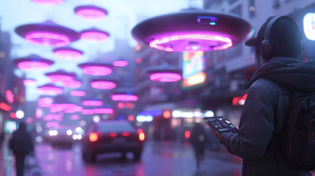A person in a dark jacket and helmet operates a drone, with a blurred background of a futuristic city street illuminated by numerous glowing, pink-purple UFO-like objects hovering above.