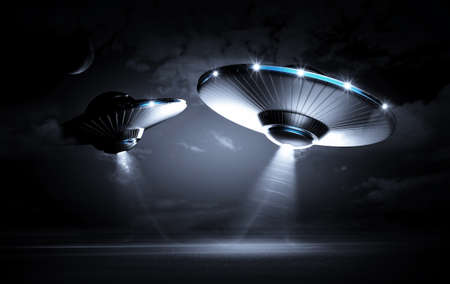 Flying saucers in the night sky. 3d rendering.