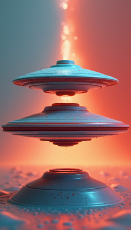 A stunning depiction of three futuristic UFOs levitating above a reflective surface, radiating a mesmerizing glow of orange and blue light. This captivating scene evokes a sense of wonder and curiosity, inviting viewers to imagine the mysteries of the universe and the possibilities of extraterrestrial life.