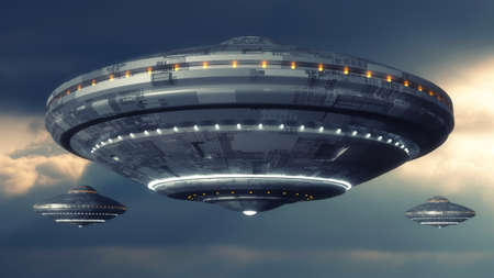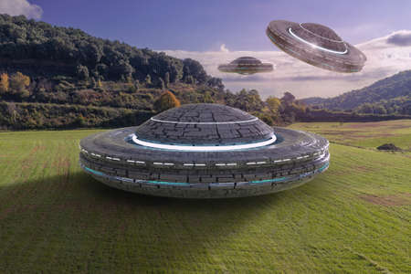 Close encounters of the third kind. Unidentified objects coming from space. Contact with extraterrestrials UFO. 3D illustration.