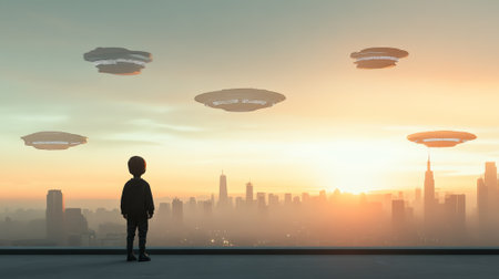 Child standing on a rooftop is watching a fleet of unidentified flying objects hovering over the new york city skyline during a vibrant sunset