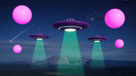 Three purple UFOs emit green beams over a mountain landscape at night with floating pink spheres in the sky. The scene is digitally illustrated with a cosmic and mysterious mood.