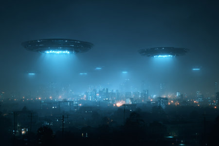 Futuristic cityscape at night with glowing ufos hovering above, creating a mysterious and otherworldly atmosphere