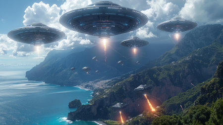 A captivating spectacle unfolds as a fleet of sleek, enigmatic UFOs hovers majestically above an ethereal coastal haven Their hulls shimmer with an otherworldly radiance, casting vibrant beams that dance across the tranquil waters and illuminate the lush greenery below As the celestial visitors interact with their terrestrial surroundings, an enigmatic dance of light and energy unfolds, creating an awe-inspiring extraterrestrial event that will forever imprint itself upon the minds of witnesses AI Generative