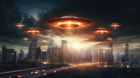 A detailed digital rendering of a fleet of futuristic UFOs hovering above a modern cityscape, showcasing advanced technology and a sense of mystery.