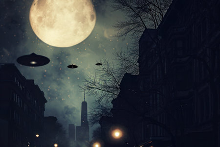 A fleet of flying saucers soar through the midnight sky over a city, creating an otherworldly art painting against the backdrop of the moon and stars
