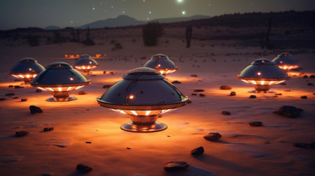 Illuminated UFOs close up in desert under night sky. Futuristic alien spaceships. Suitable for science fiction or paranormal themes