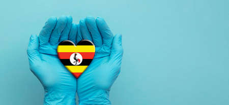 Doctors hands wearing surgical gloves holding Uganda flag heart