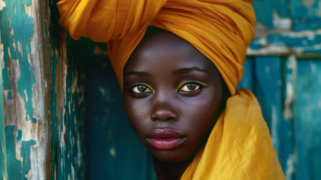 A young woman showcases her radiant beauty with a colorful headwrap and expressive eyes. She stands out among a vibrant group, celebrating cultural heritage with traditional clothing and joyful spirit.