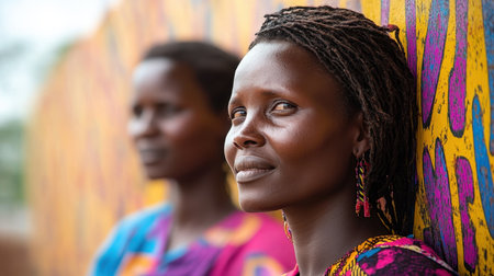Two women stand in front of a colorful mural, showcasing their unique traditional outfits. The atmosphere reflects a sense of community and cultural celebration, highlighting the beauty and diversity of their heritage.