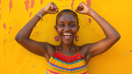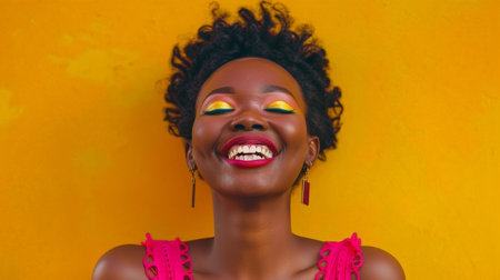 Sunny Radiance: African Woman with Striking Makeup and Lively Smile Against Yellow Background