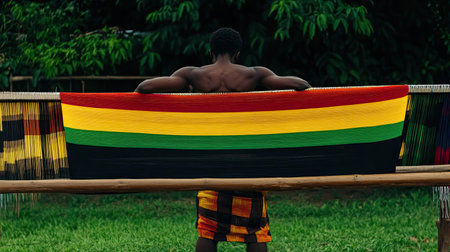 A Ghanaian kente cloth weaver sitting at a wooden loom, surrounded by vibrant threads in yellow, red, green, and black, the natural light highlighting the intricate patterns --chaos 12 --ar 16:9 --weird 150 --v 6.1 Job ID: 6b4b3433-c7d1-4913-b56f-9319c79078fd