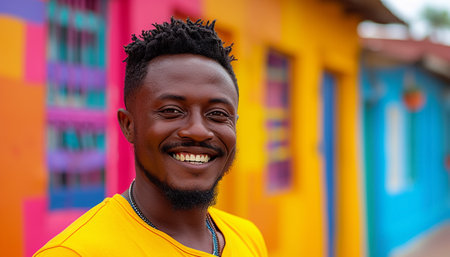 Portrait of a handsome African man in a colorful shirt looking at camera