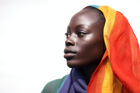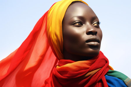 A woman is depicted wearing a vibrant and colorful head wrap. The head wrap features a variety of hues and patterns, adding a touch of cultural flair to her appearance.