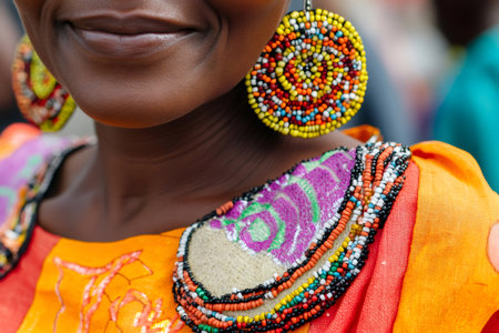 Close up of a Senegalese woman showcasing vibrant traditional attire and beaded jewelry, celebrating rich cultural heritage