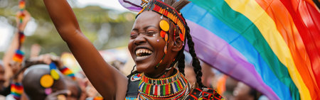 A woman is holding a rainbow flag and smiling. Concept of joy and celebration