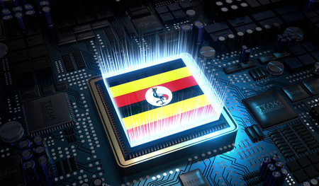 Detailed 3D rendering closeup of the flag of Uganda. Flag has a detailed realistic fabric texture and an accurate design and colors.
