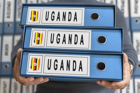 Uganda flag on minimalist paper background. National invitation letter with stylish pen on stone. Communication concept.