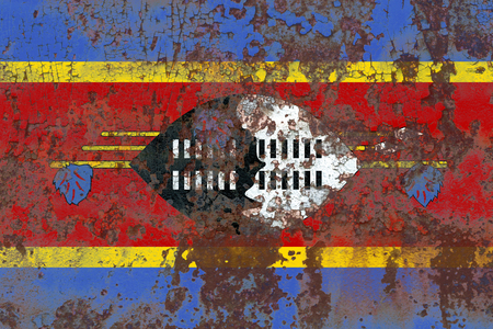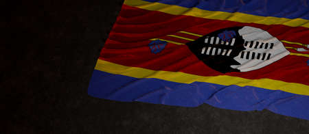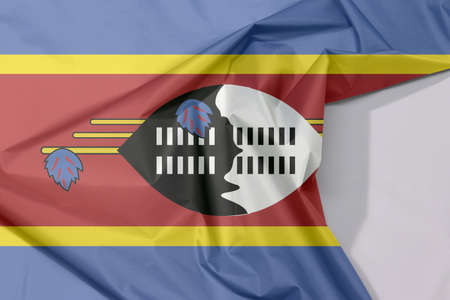 Swaziland fabric flag crepe and crease with white space, blue yellow and red with the large black and white Nguni shield and the staff decorated with the feather tassels.