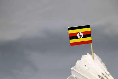 Mini Uganda flag stick on the white shuttlecock on the grey background. Concept of badminton sport.