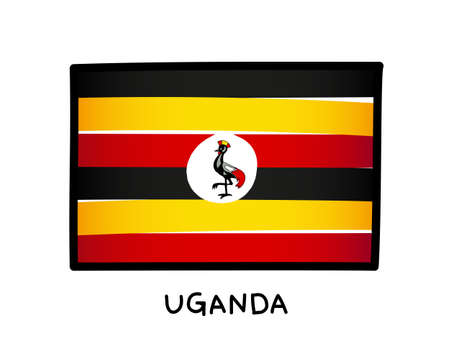 Flag of Uganda. Colorful Uganda flag. Black, yellow and red brush strokes, hand drawn. black outline. Vector illustration isolated on white background.