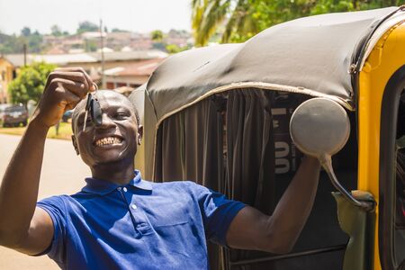 cheerful african man winner holding a key celebrating and jubilant standing next to an auto rickshaw taxi outdoor