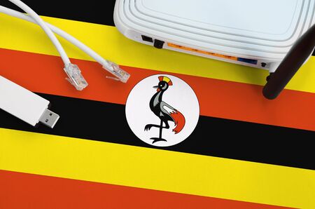 Uganda flag depicted on table with internet rj45 cable, wireless usb wifi adapter and router. Internet connection concept