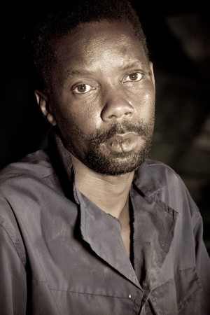 Arusha, Tanzania - December 24, 2019: African happy guy on the street with a bag of straw on head near home in Arusha, Tanzania, East Africa, close up