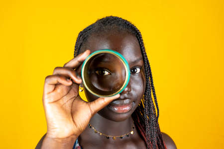 portrait of young cute african teen having fun looking into an ethnic bracelet. Studio shot on yellow background