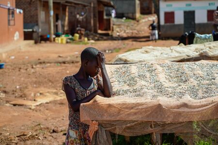 December, 2019. Africa, Uganda, village . A dark-skinned girl, standing leaning on a structure for drying nets with small fish from the lake, thought