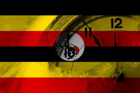 Uganda flag with clock close to midnight in the background. Happy New Year concept