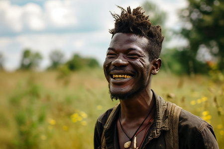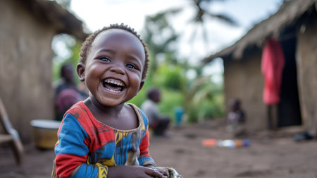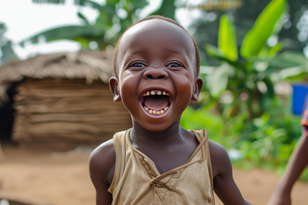Cheerful young african boy laughs heartily against a rural backdrop, exuding happiness