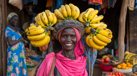 Happy African woman selling fresh bananas with a big smile on her face, close-up portrait, emotions concept, banner